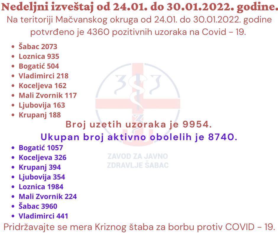 Na teritoriji Mačvanskog okruga, od 24-og januara do juče, potvrđeno je 4.360 pozitivnih uzoraka na Kovid 19 i to u - Šapcu - 2.073, Loznici 935, Bogatiću 504, Vladimircima 218, Koceljevi 162, Malom Zvorniku 117, Ljluboviji 163 i u Krupnju 188 novoobolelih. Prema podacima Zavoda za javno zdravlje, broj uzetih uzoraka je 9.954., a ukupan broj aktivno obolelih u okrugu trenutno je 8.740 - od toga u Šapcu 3.960.